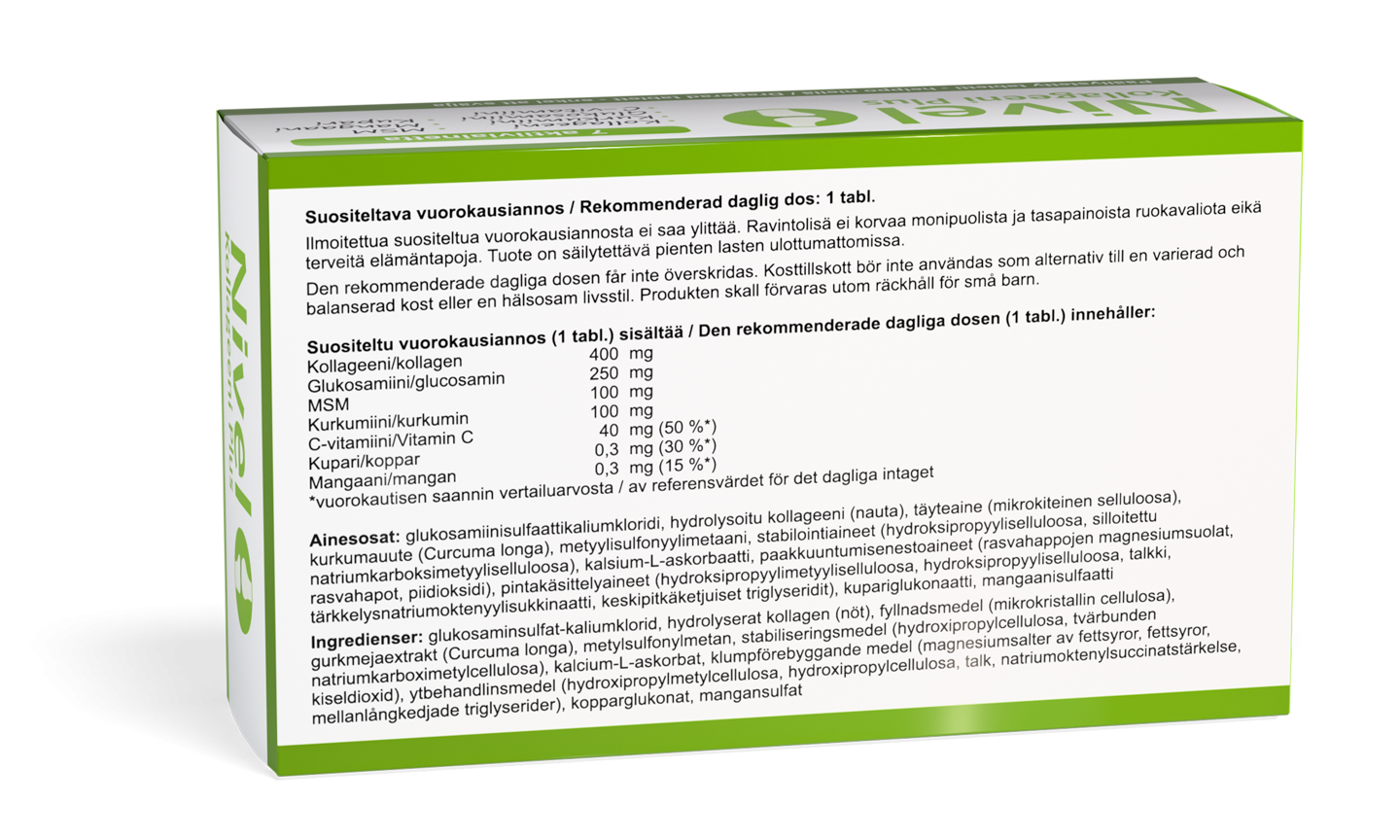 Ainesosat: glukosamiinisulfaattikaliumkloridi, hydrolysoitu kollageeni (nauta), täyteaine (mikrokiteinen selluloosa), kurkumauute (Curcuma longa), metyylisulfonyylimetaani, stabilointiaineet (hydroksipropyyliselluloosa, silloitettu natriumkarboksimetyyliselluloosa), kalsium-L-askorbaatti, paakkuuntumisenestoaineet (rasvahappojen magnesiumsuolat, rasvahapot, piidioksidi), pintakäsittelyaineet (hydroksipropyylimetyyliselluloosa, hydroksipropyyliselluloosa, talkki, tärkkelysnatriumoktenyylisukkinaatti, keskipitkäketjuiset triglyseridit), kupariglukonaatti, mangaanisulfaatti
