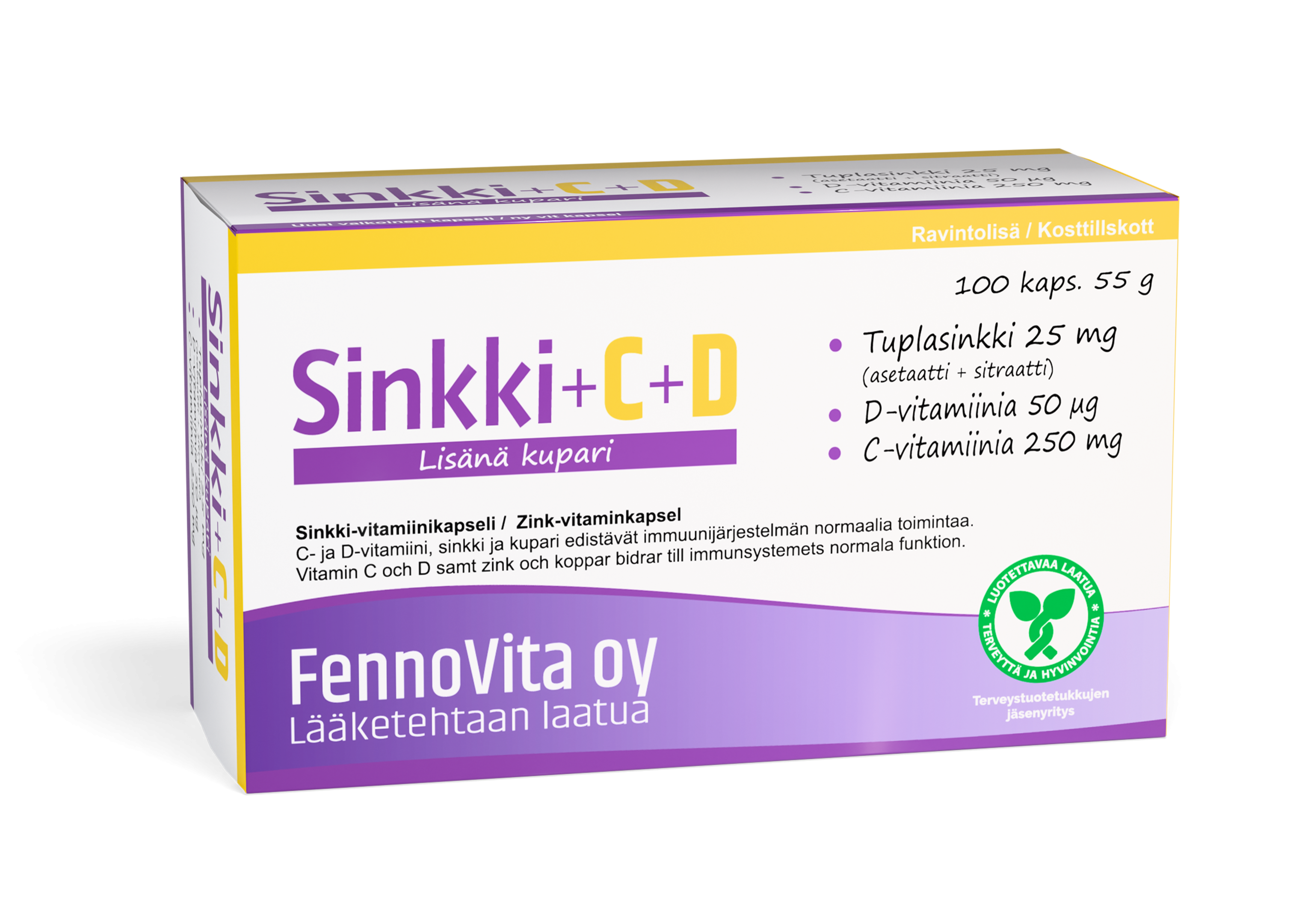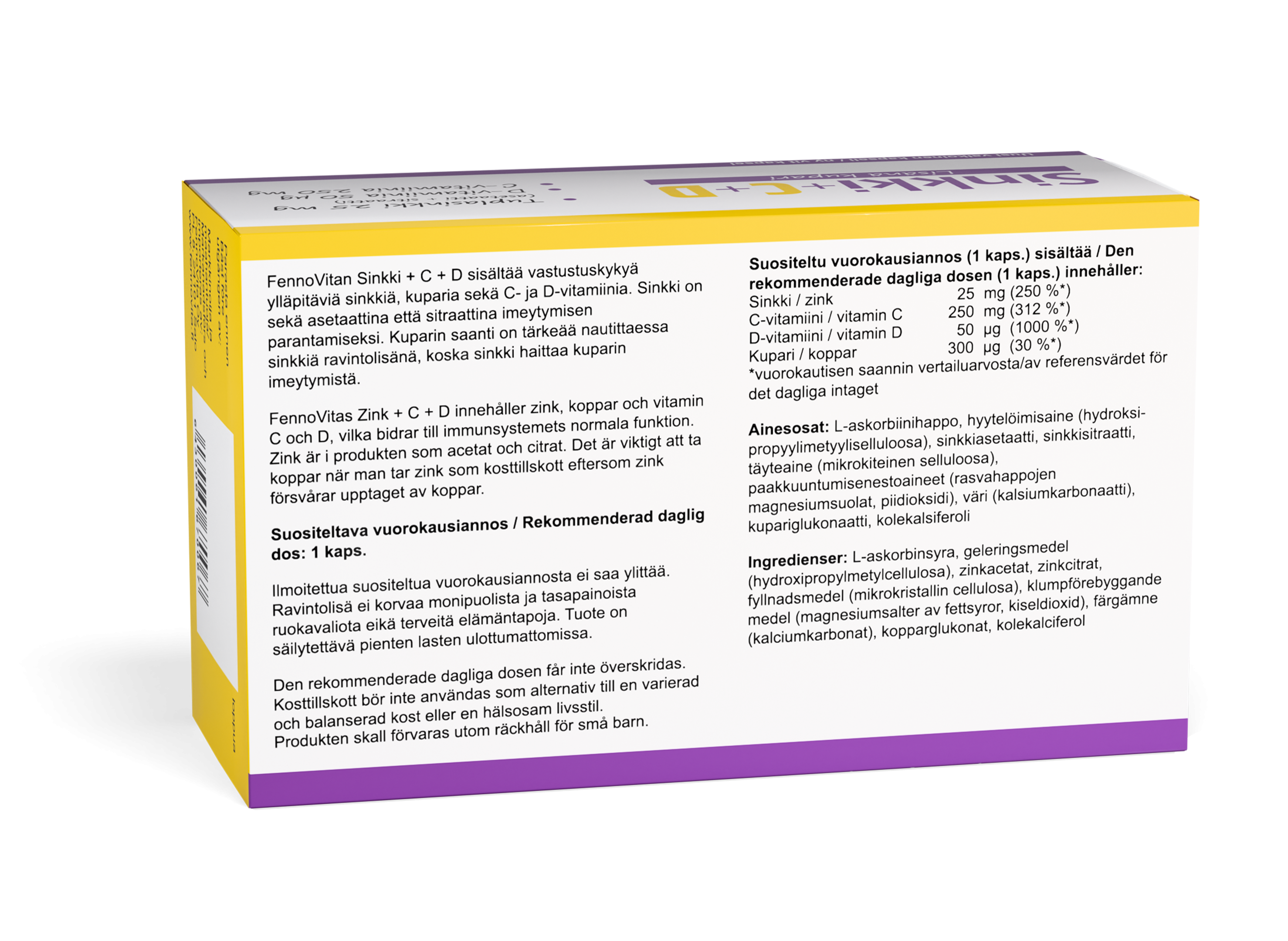 FennoVitan Sinkki + C + D sisältää vastustuskykyä ylläpitäviä sinkkiä, kuparia sekä C- ja D-vitamiinia. Sinkki on sekä asetaattina että sitraattina imeytymisen parantamiseksi. Kuparin saanti on tärkeää nautittaessa sinkkiä ravintolisänä, koska sinkki haittaa kuparin imeytymistä.